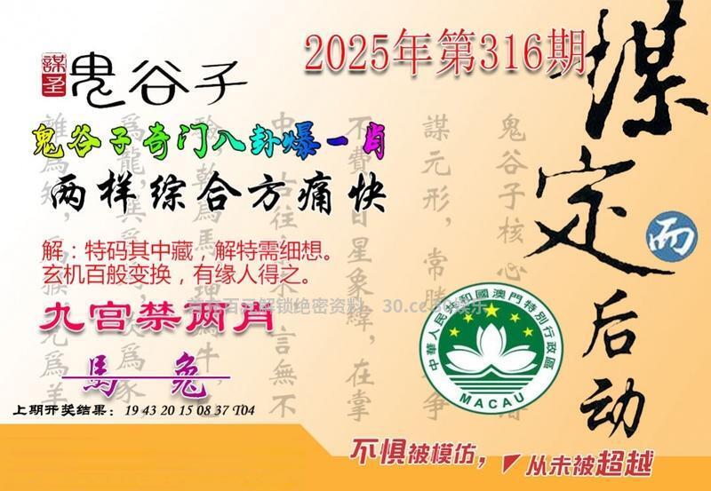 | 316期鬼谷子:两样综合方痛快 解释:“两样综合方痛快”形容的就是这种无拘无束、尽情享受的快乐状态 综合:猴龙猪羊蛇兔虎马 |